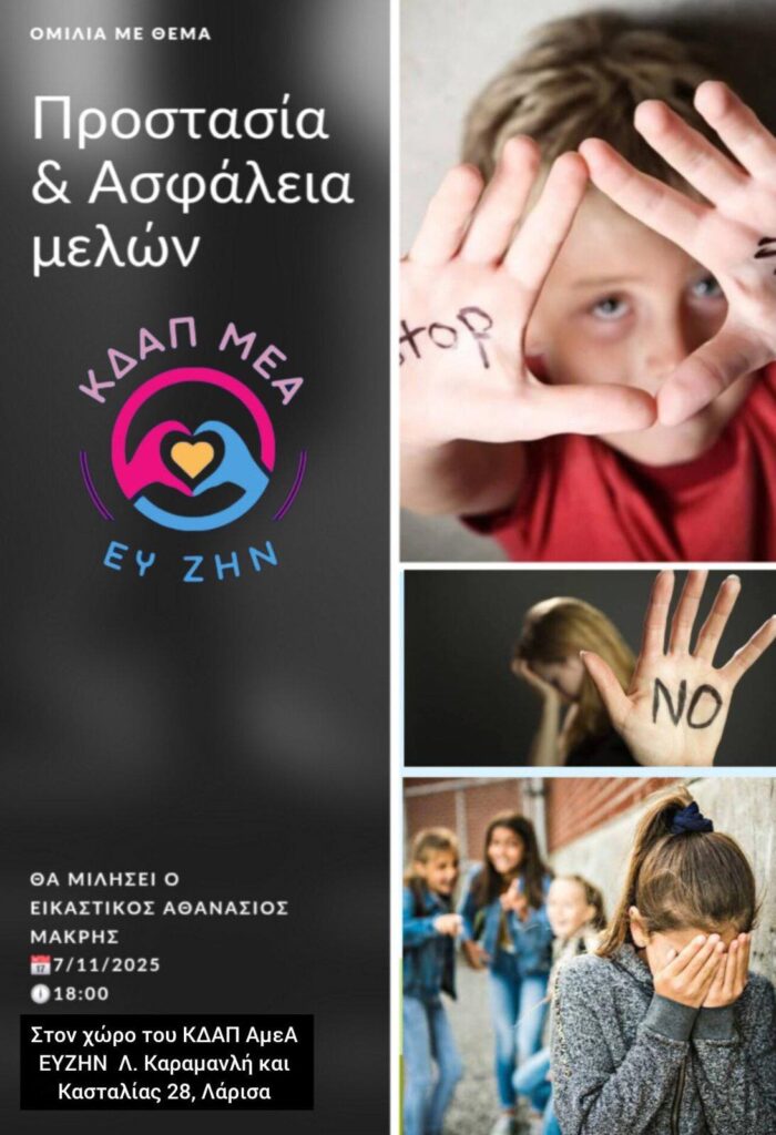 Σας προσκαλούμε στην ομιλία που θα πραγματοποιηθεί αύριο 08/11 και ώρα 18:00, στον χώρο του ΚΔΑΠ μας, με θέμα: Προστασία και Ασφάλεια των Μελών.